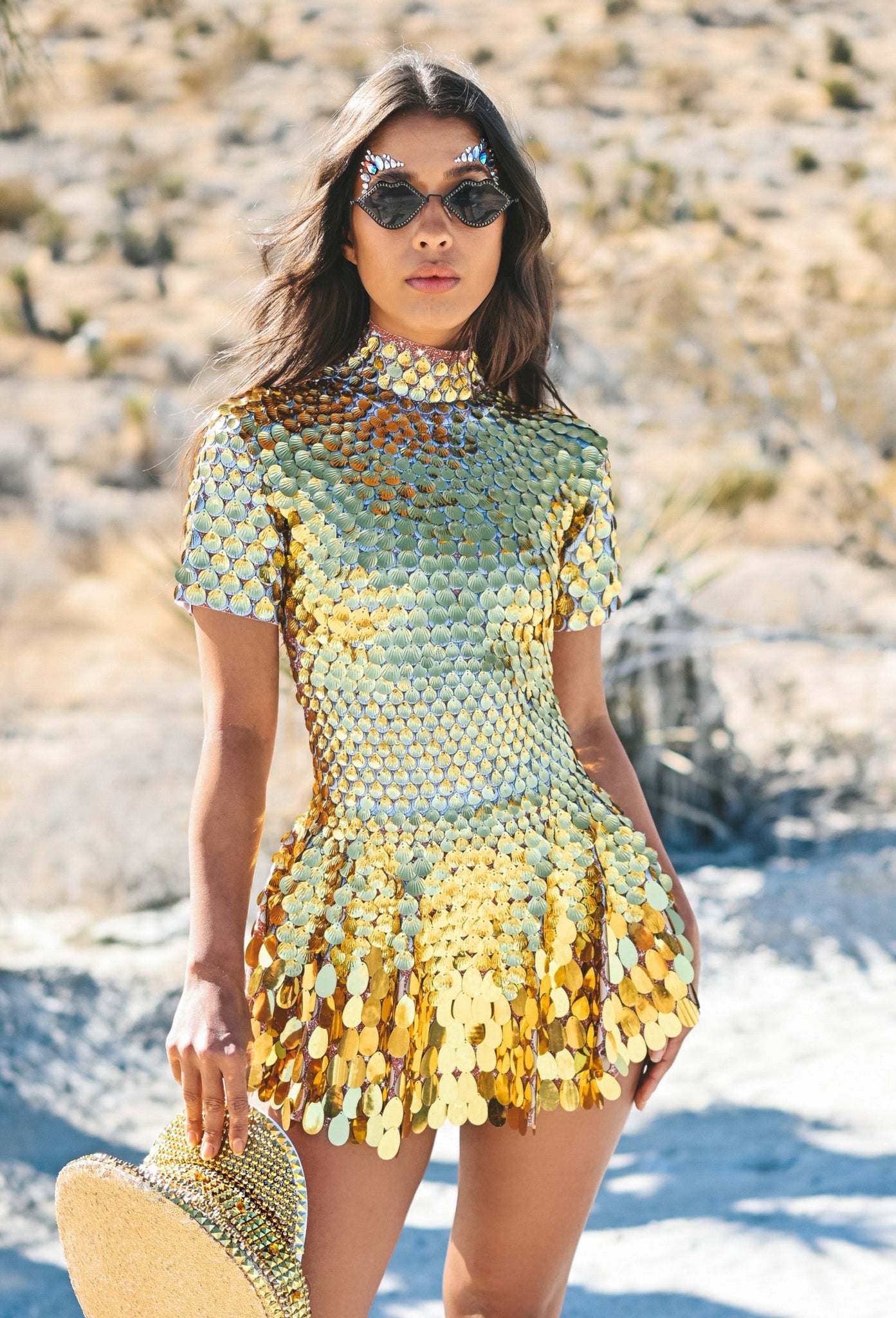 The Ciel De Minuit Sequin Bodysuit Mini Dress by aikergoods the ultimate party-ready outfit, designed to dazzle at any club, rave, or special event. Featuring a figure-hugging bodysuit silhouette covered in shimmering sequins, this dress catches every light, making it perfect for metallic rave seashell parties or a sparkling New Year¡¯s Eve performance Sparkle Club Festival or even burning man or coachell. Its bold, radiant style ensures you'll stand out and shine at any club performance or celebration.