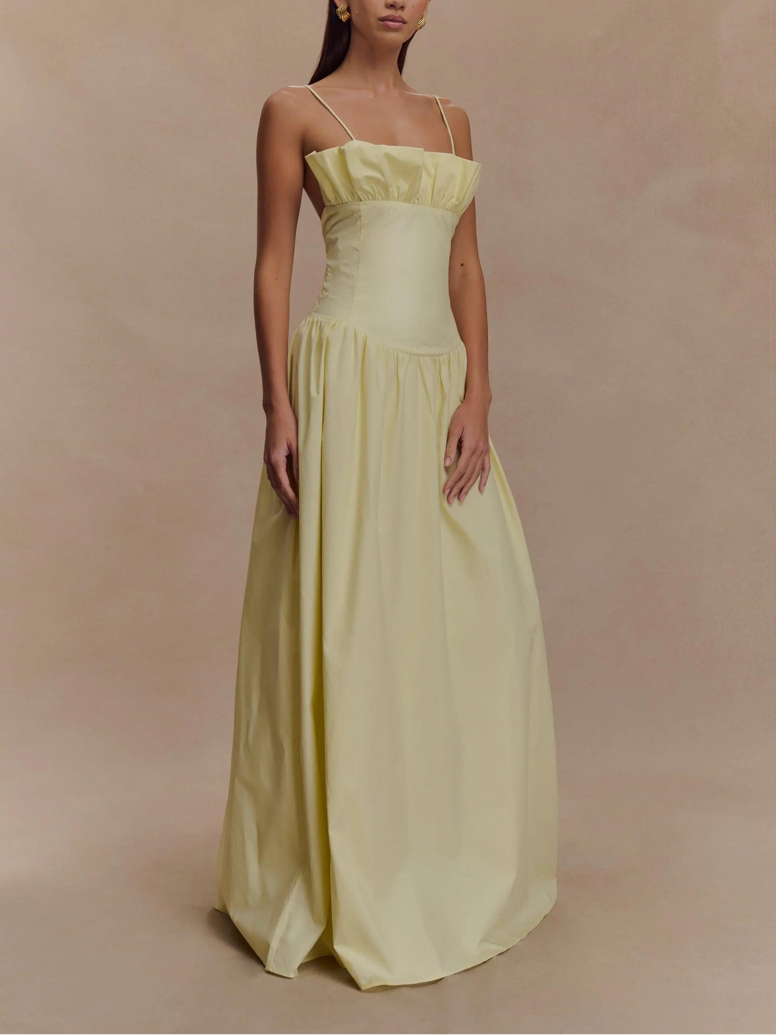Say hello to spring in the sweetest way. The JANIS Cotton Frill Maxi Dress in a fresh lemon hue channels feminine charm with a lighthearted, breezy spirit. Designed with a delicately frill-gathered neckline and slender spaghetti straps, this maxi dress flatters with its fitted bodice and curved waist seam that highlight your natural shape. The drop waist gives way to a full, gathered skirt that flows beautifully with every step¡ªadding just the right amount of drama and ease.